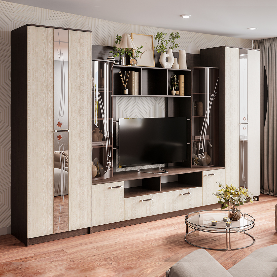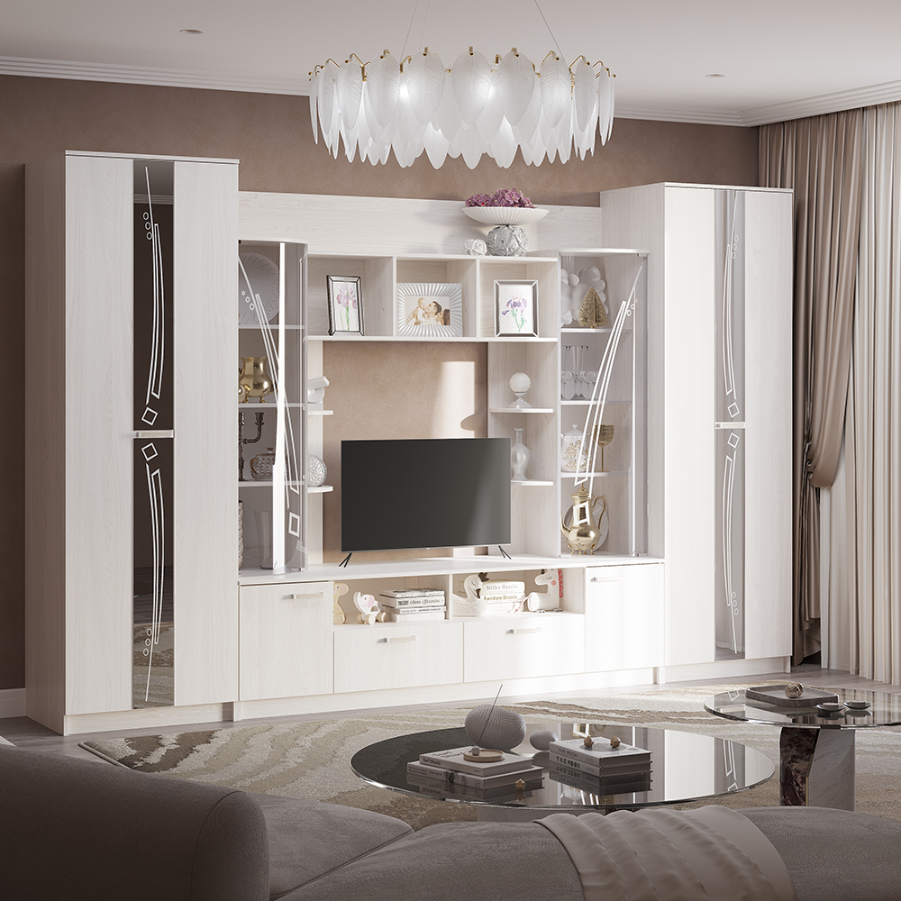 Элегантная модульная стенка от мебельной фабрики российского производителя - стильная и вместительная мебель для современной гостиной.
