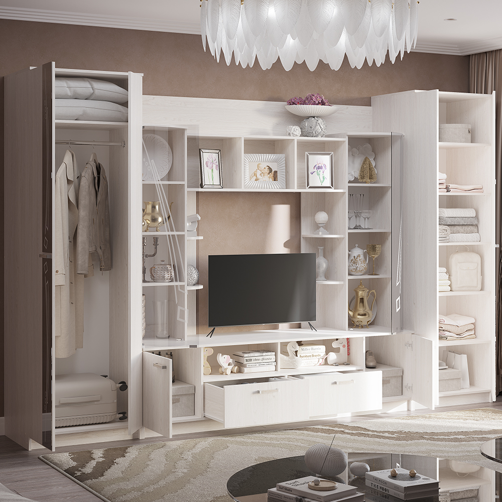 Гостиная «Венеция» – идеальный вариант для размещения большого количества вещей, включая одежду, ведь данная модель имеет зоны для ее хранения. ТВ-зона, выдвижные ящики, ниши для техники и открытые полки гармонично вписаны в дизайн гостиной.