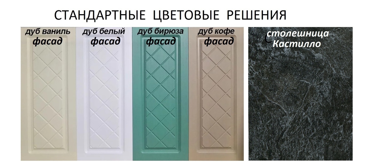 - Фасады стандартных цветов (входят в стоимость ): Дуб ваниль, Дуб белый, Дуб бирюза, Дуб кофе