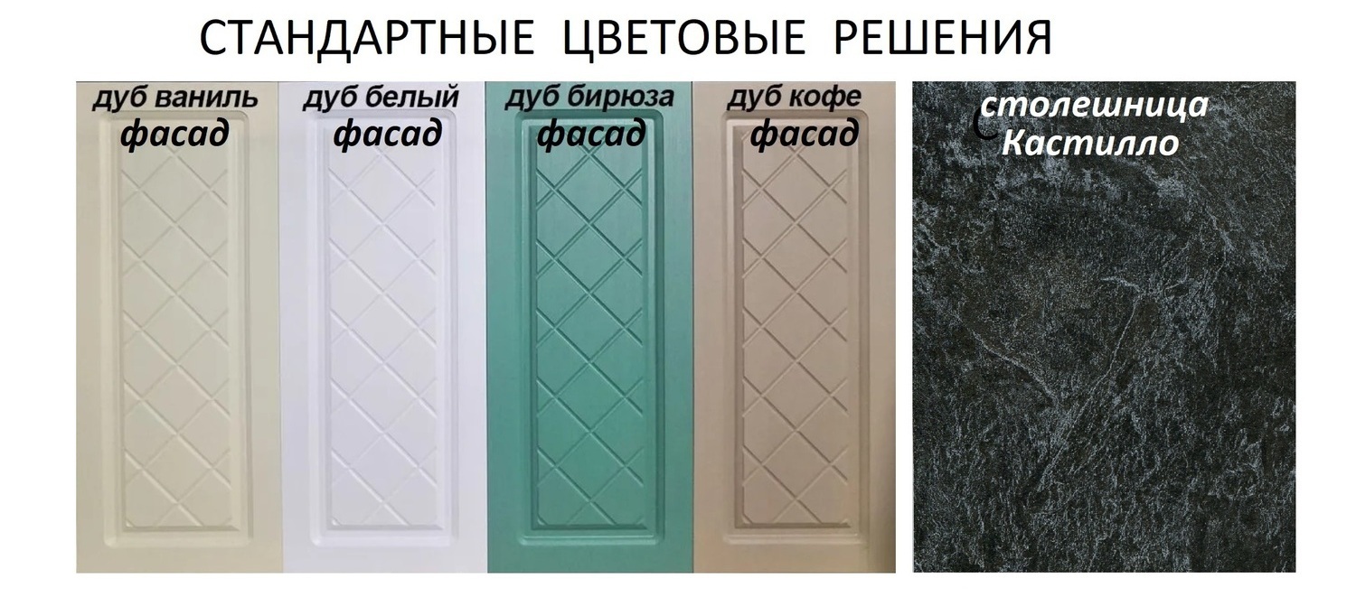 - Фасады стандартных цветов (входят в стоимость ): Дуб ваниль, Дуб белый, Дуб бирюза, Дуб кофе