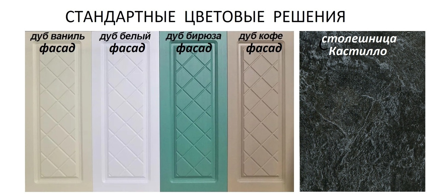 - Фасады стандартных цветов (входят в стоимость ): Дуб ваниль, Дуб белый, Дуб бирюза, Дуб кофе