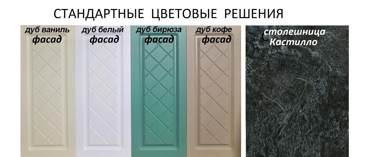 - Фасады стандартных цветов (входят в стоимость ): Дуб ваниль, Дуб белый, Дуб бирюза, Дуб кофе