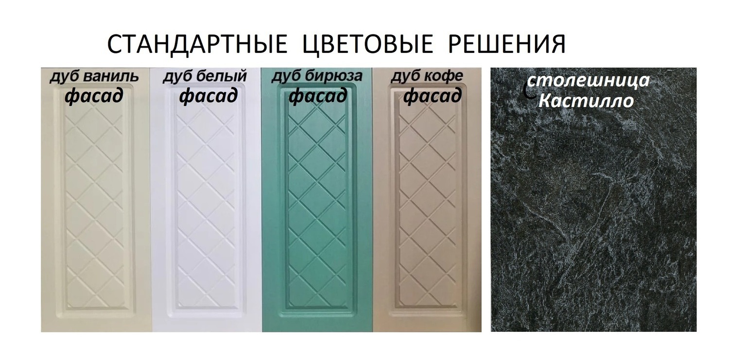 - Фасады стандартных цветов (входят в стоимость ): Дуб ваниль, Дуб белый, Дуб бирюза, Дуб кофе