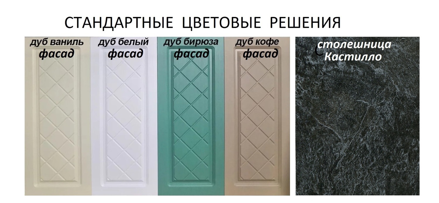 - Фасады стандартных цветов (входят в стоимость ): Дуб ваниль, Дуб белый, Дуб бирюза, Дуб кофе