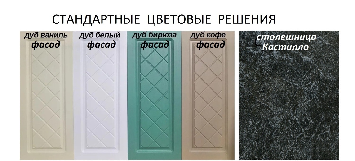 - Фасады стандартных цветов (входят в стоимость ): Дуб ваниль, Дуб белый, Дуб бирюза, Дуб кофе