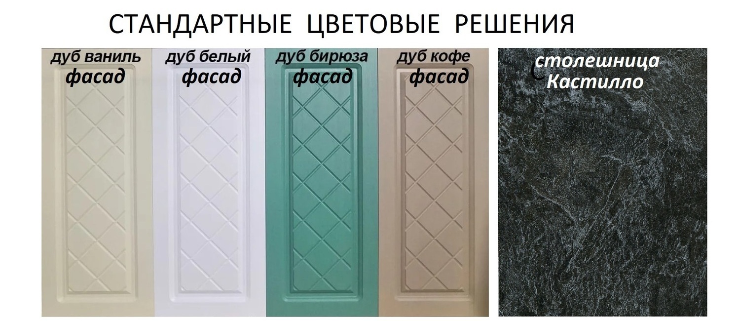 - Фасады стандартных цветов (входят в стоимость ): Дуб ваниль, Дуб белый, Дуб бирюза, Дуб кофе