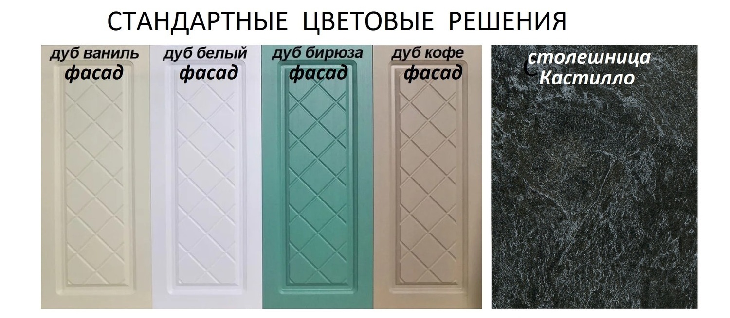 - Фасады стандартных цветов (входят в стоимость ): Дуб ваниль, Дуб белый, Дуб бирюза, Дуб кофе