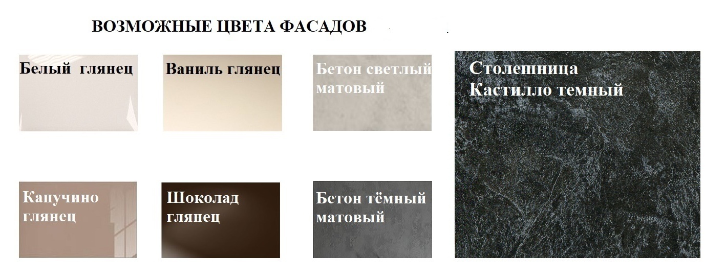 Фасады стандартных цветов (входят в стоимость) : Белый глянец, Ваниль глянец, Шоколад глянец, Капучино глянец, Бетон темный матовый, Бетон светлый матовый