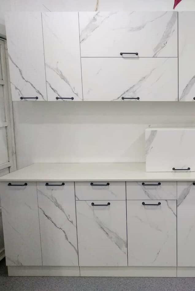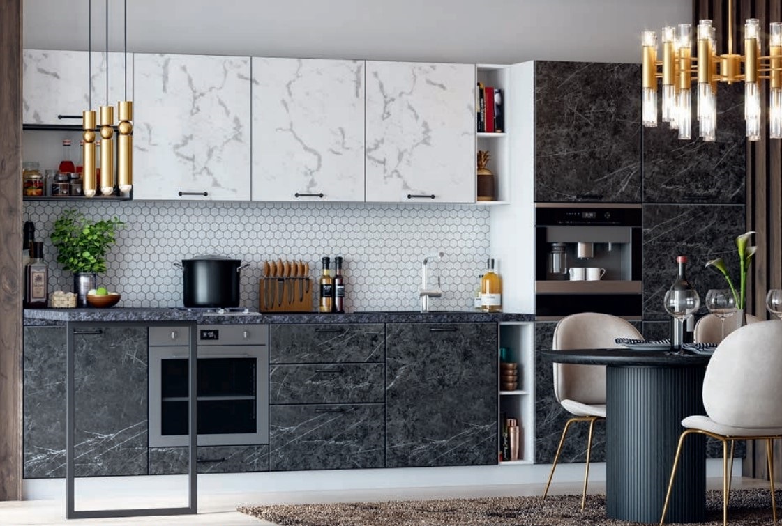Красивая модульная кухня Novi (Нови) выглядит достойно и элегантно: отделка фасадов стилизована под мрамор, реалистично имитируя текстуру и оттенки благородного камня благодаря качественному покрытию.