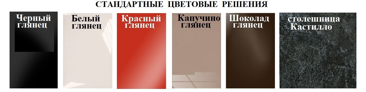 - Фасады стандартных цветов (входят в стоимость ): Белый глянец, Черный глянец, Красный глянец, Капучино глянец, Шоколад глянец