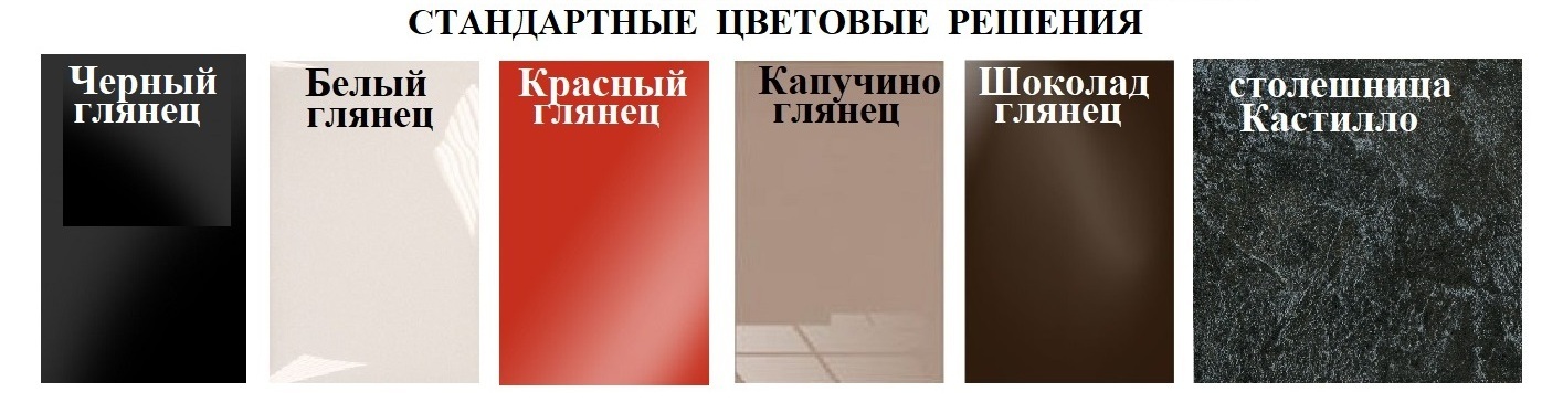 - Фасады стандартных цветов (входят в стоимость ): Белый глянец, Черный глянец, Красный глянец, Капучино глянец, Шоколад глянец