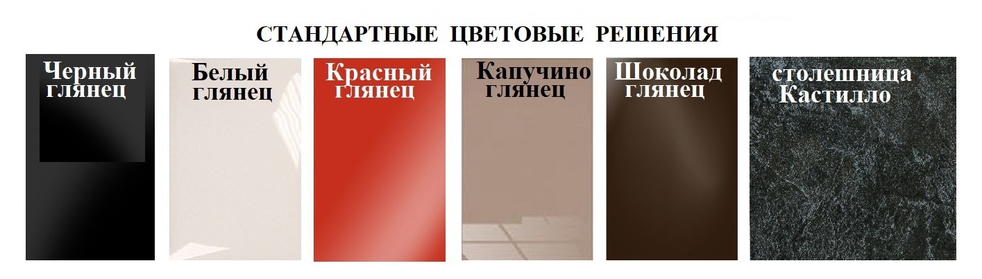 - Фасады стандартных цветов (входят в стоимость ): Белый глянец, Черный глянец, Красный глянец, Капучино глянец, Шоколад глянец
