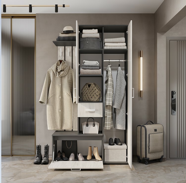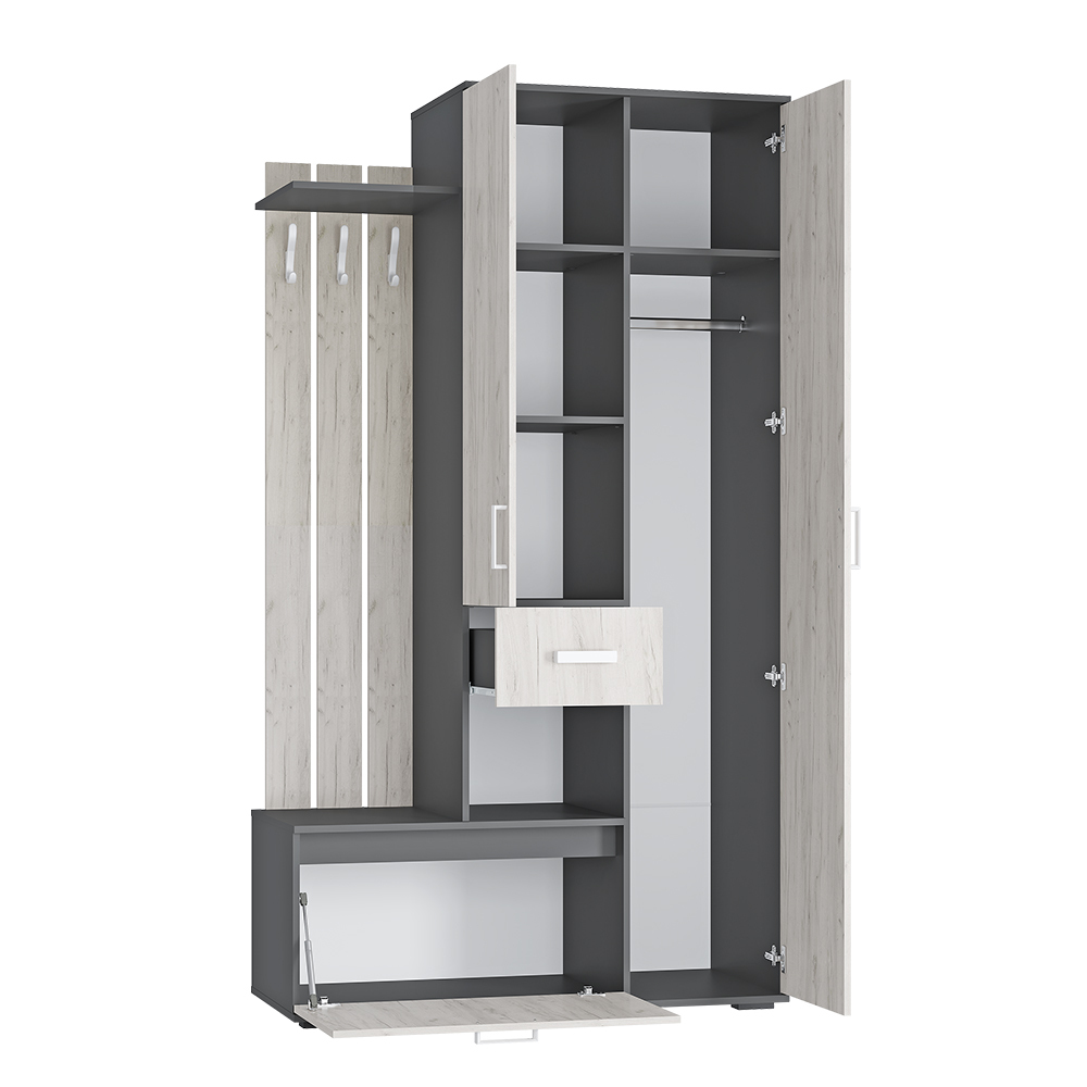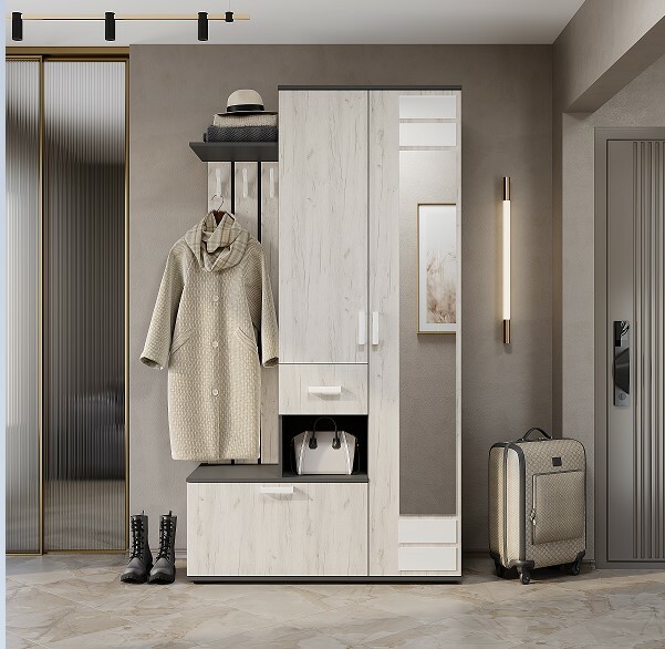 Эффектный внешний вид сочетается с продуманной функциональностью: крючки для верхней одежды, обувница, выкатной ящик для мелочей, шкаф для верхней одежды со штангой и антресольной полкой.