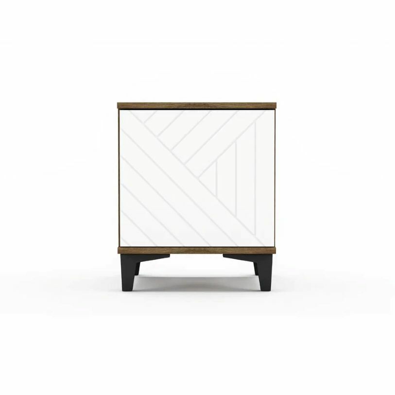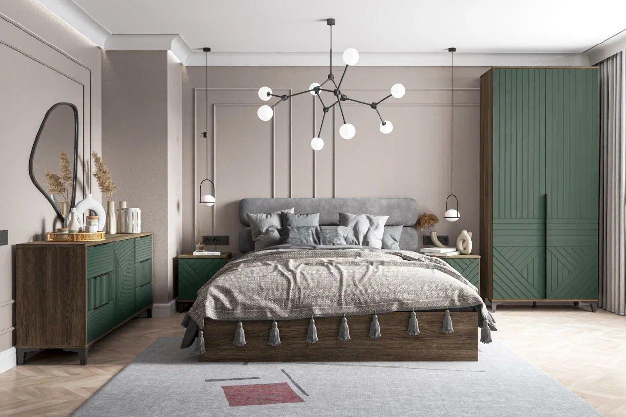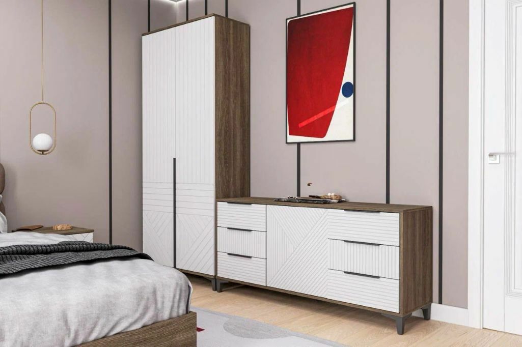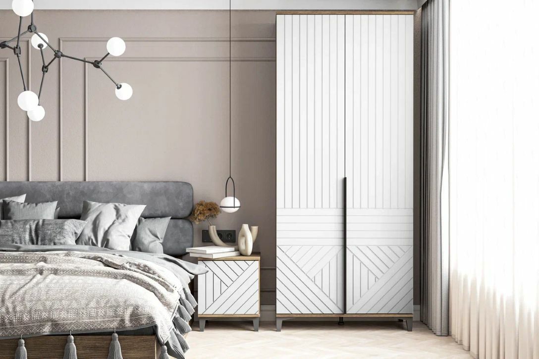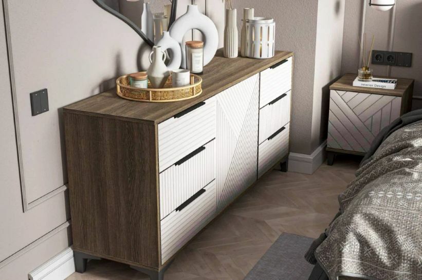 Фасады шкафов, комода и прикроватных тумбы декорированы красивым геометрическим узором из различных фрезерованных линий.